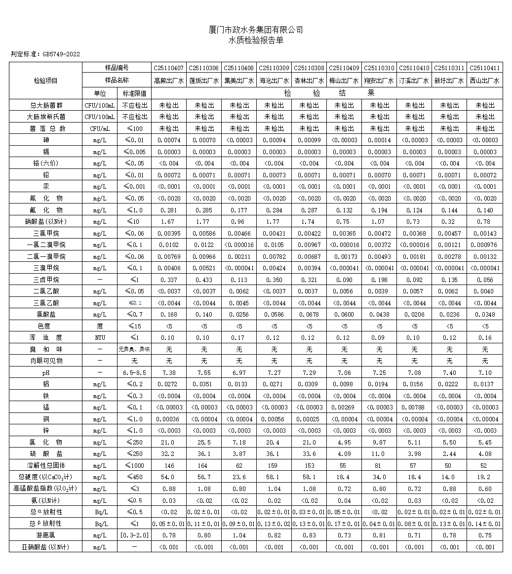2025年11月亚洲情色 给水厂出厂水42项指标