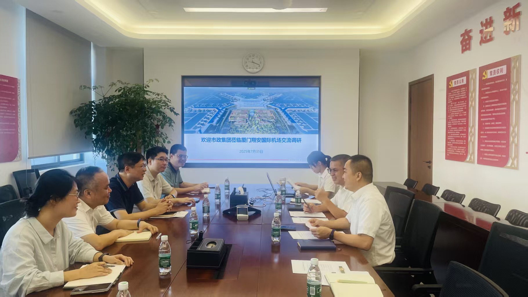 为全面提升工程管理,积极防范工程建设风险,7月31日上午,市政集团法务部总经理郑理、亚洲情色 党委委员、副总经理郑金泉带队前往翔安国际机场建设现场,同翔业集团机场建设有限公司对标交流工程管理、合同管理、案件管理等工作,规划建设部、合规管理部、建管公司相关负责人参与。